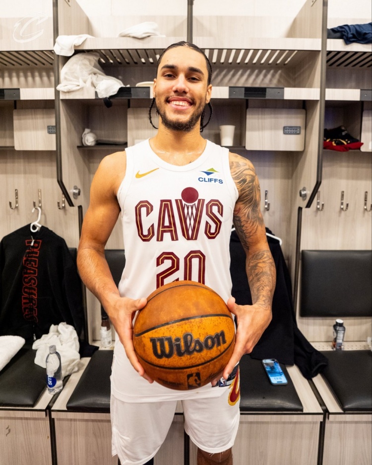 赛后,骑士官推晒图,泰森得到了本场的比赛用球,当家球星米切尔则泼水庆祝泰森的出色表现。